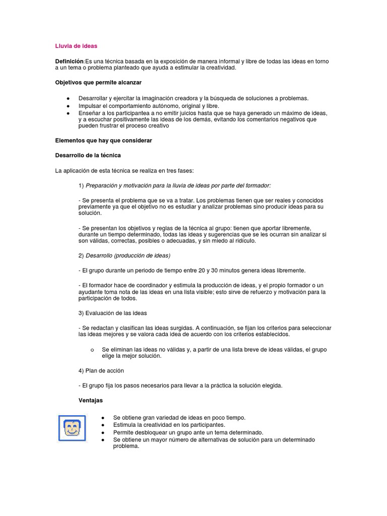 Web La lluvia de ideas es una dinámica de grupo que se utiliza en varias empresas como técnica para resolver problemas específicos desarrollar nuevas ideas o. Web La aplicación de esta técnica se realiza en tres fases.